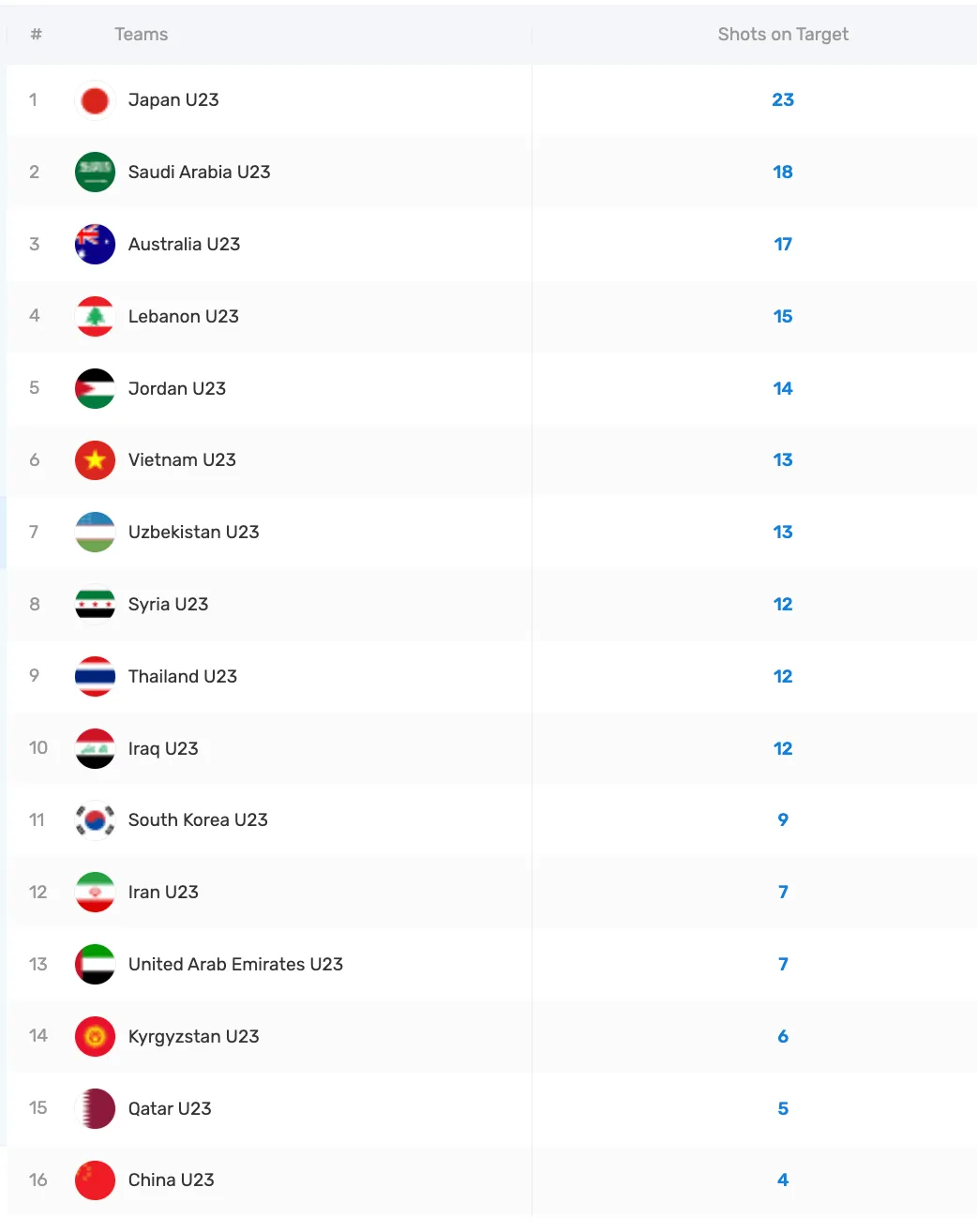 [流言板]U23亞洲杯小組賽射正榜:日本23次第1沙特第2,板U杯小榜日本次中國4次墊底由虎撲足球資訊 發(fā)表在中國足球 https://bbs.hupu.com/china-soccer